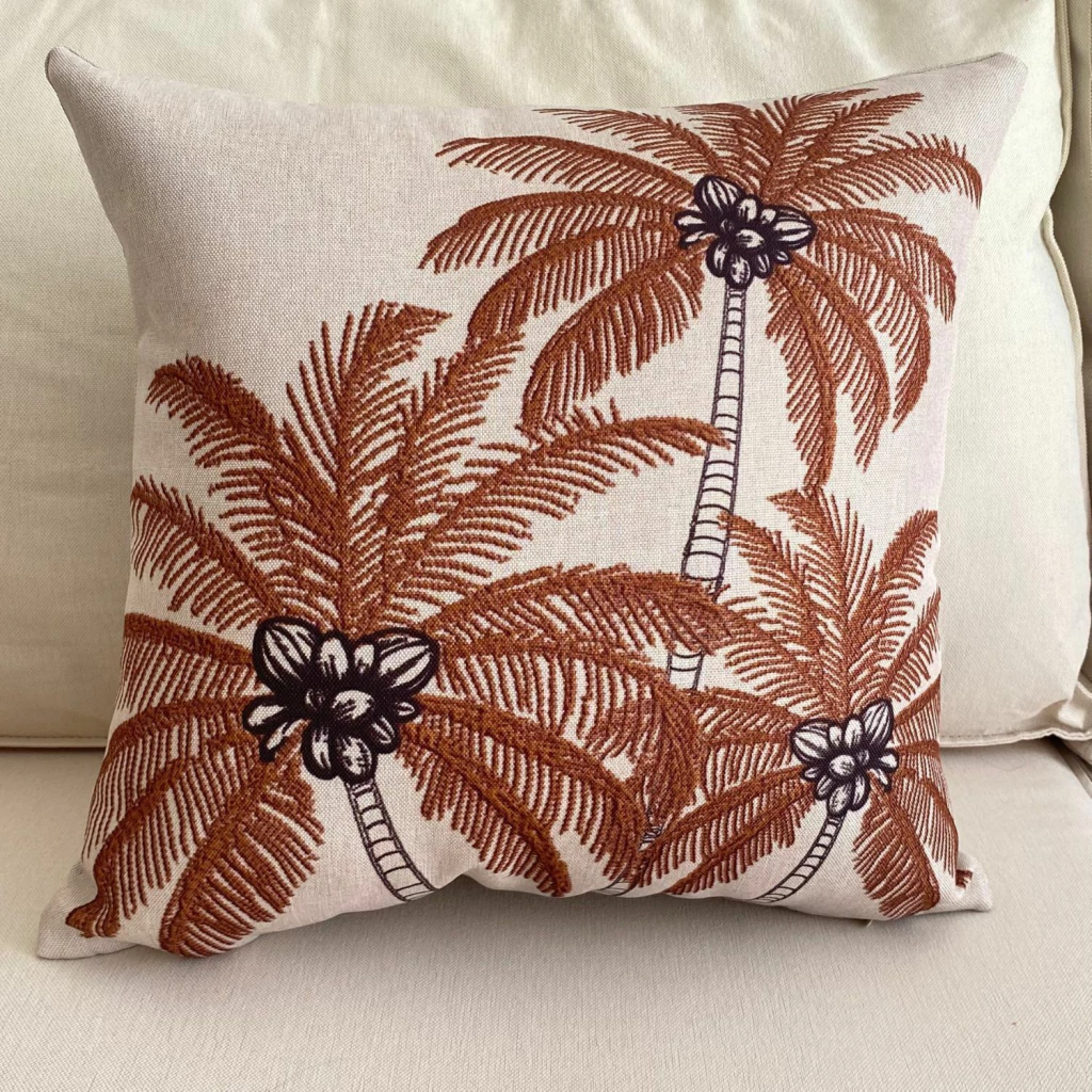 Capa de Almofada Linho Broderie Coqueiros Terracota 43cm
