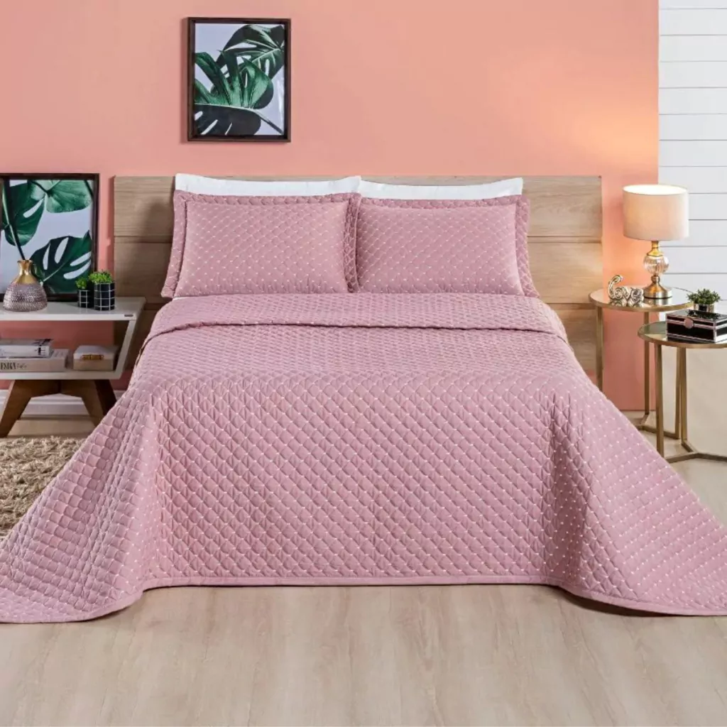 O acabamento em 3D no tecido é o detalhe que faz toda a diferença. Cada linha e textura criam uma profundidade visual que transforma o cobre-leito em uma verdadeira obra de arte têxtil.