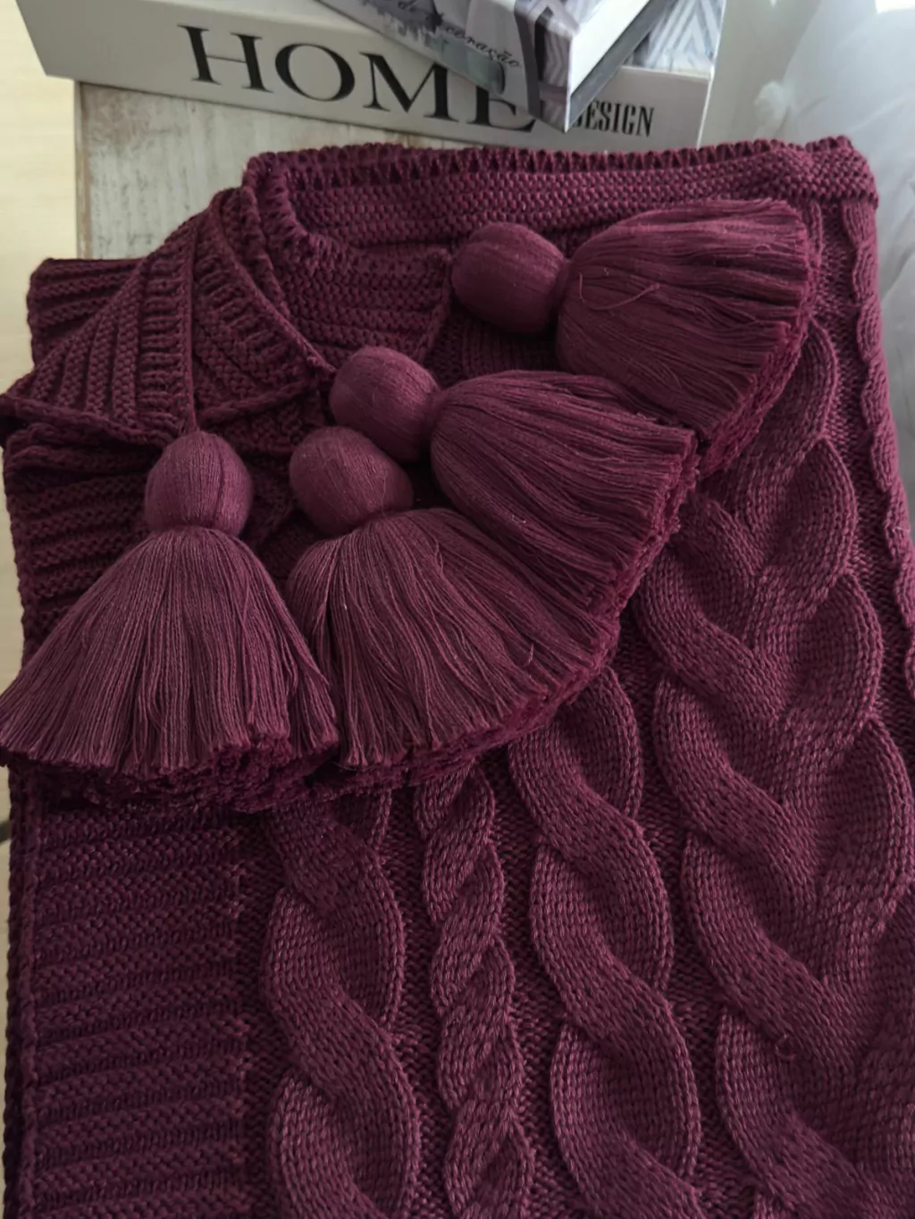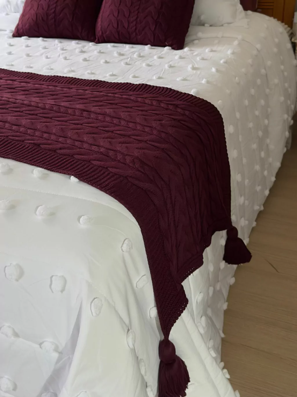 A Peseira Decorativa Tricô Luana Bordo produzida em fio Mousse, um material que possui uma mistura de fibras de acrílico, poliamida, viscose e algodão, oferecendo maciez e durabilidade para a peça, formação de As peseiras são utilizadas nos pés da cama, sendo perfeitas para trazer texturas, conforto e aconchego para o seu quarto.