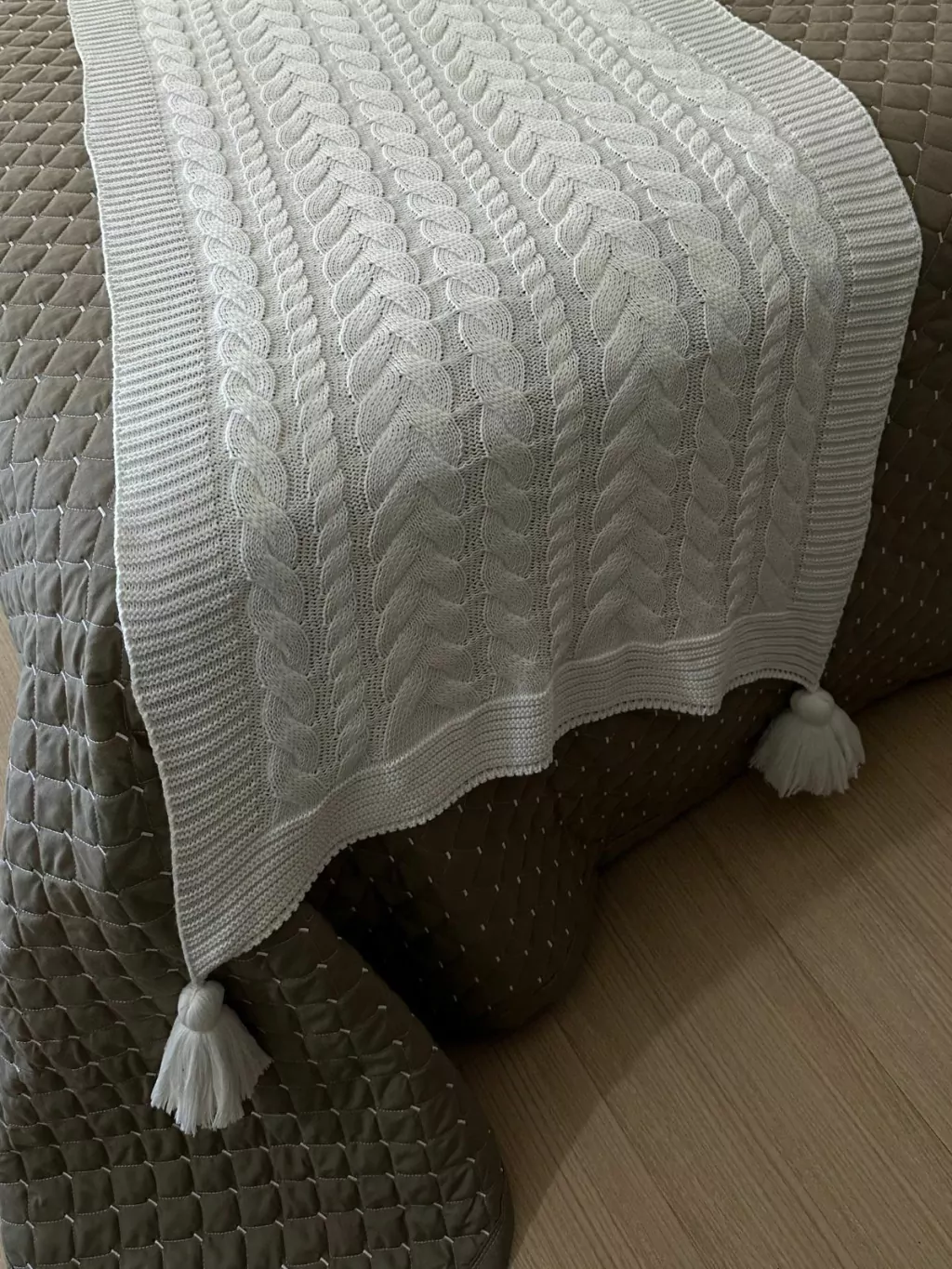 A Peseira Decorativa Tricot Luana Branco produzida em fio Mousse, um material que possui uma mistura de fibras de acrílico, poliamida, viscose e algodão, oferecendo maciez e durabilidade para a peça, além de maior resistência a formação de pilling (bolinhas). As peseiras são utilizadas nos pés da cama, sendo perfeitas para trazer texturas, conforto e aconchego para o seu quarto.