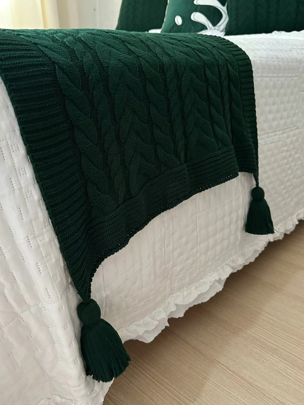 A Peseira Decorativa Tricot Luana Verde musgo produzida em fio Mousse, um material que possui uma mistura de fibras de acrílico, poliamida, viscose e algodão, oferecendo maciez e durabilidade para a peça, além de maior resistência a formação de pilling (bolinhas). As peseiras são utilizadas nos pés da cama, sendo perfeitas para trazer texturas, conforto e aconchego para o seu quarto.
